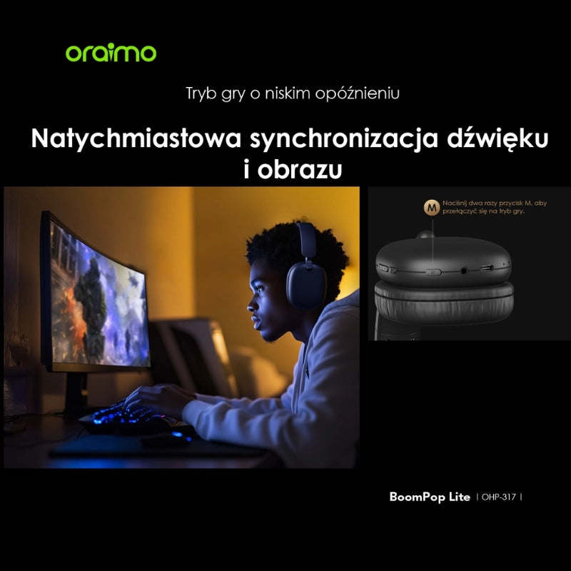 Oraimo BoomPop Lite – Bezprzewodowe słuchawki nauszne z Bluetooth 5.3, AUX i 65h pracy