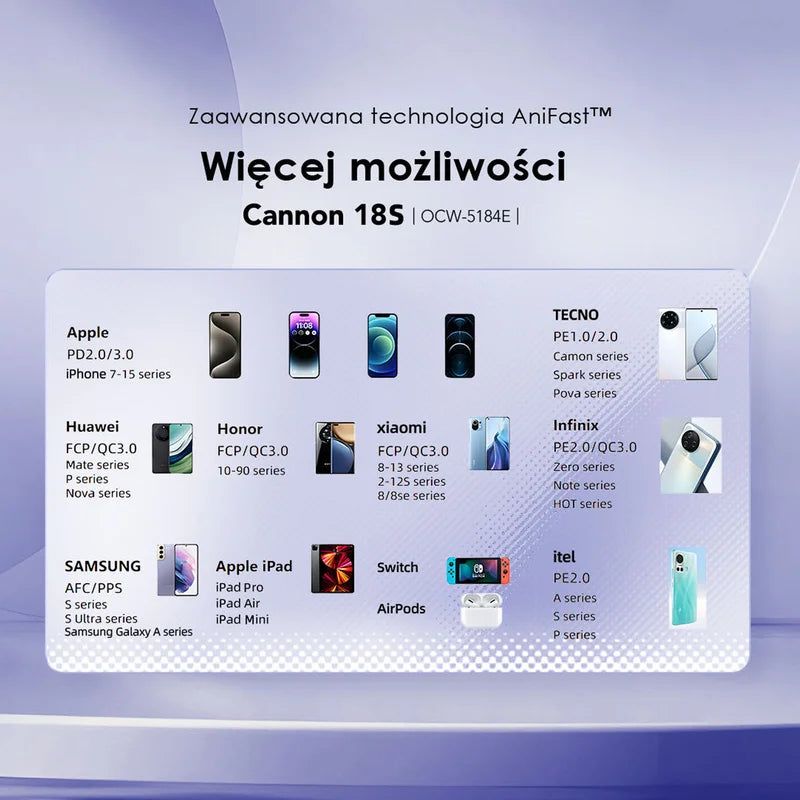 - Szybkie ładowanie 18W – nawet 4x szybciej niż klasyczna ładowarka