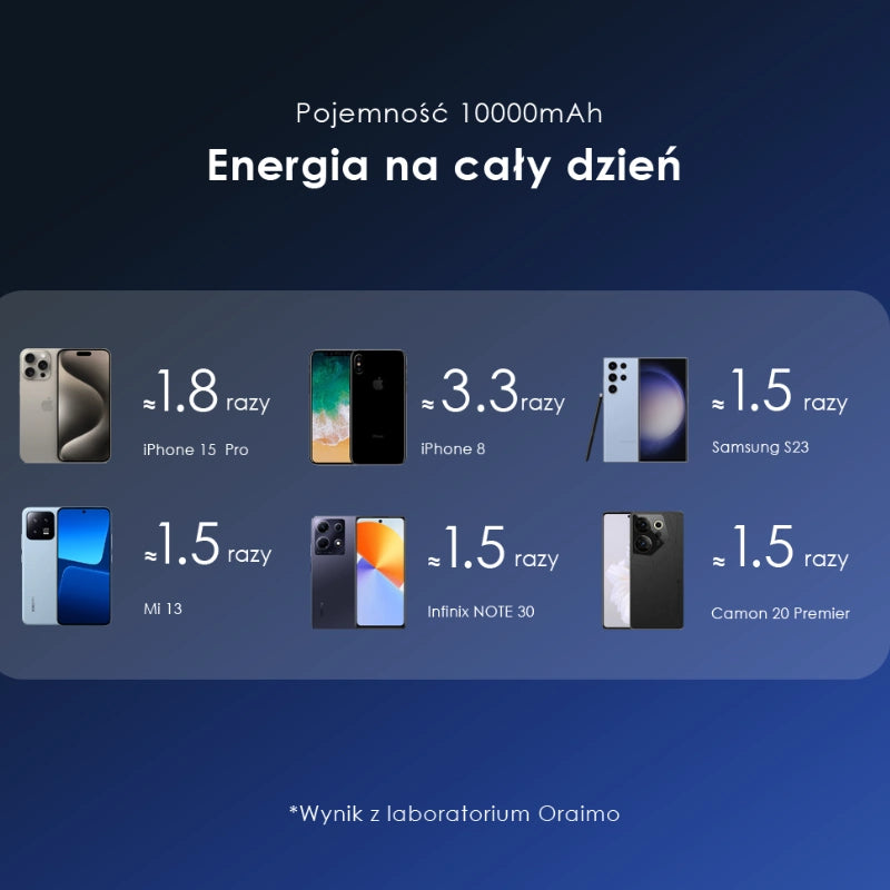 Dzięki akumulatorowi o pojemności 10000 mAh z łatwością naładujesz swoje urządzenia kilka razy bez potrzeby ponownego ładowania powerbanku.