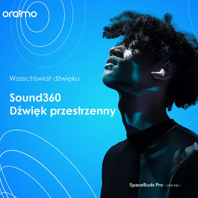 Innowacyjna technologia oraimo Sound360™ rozszerza pole dźwiękowe, tworząc efekt przestrzennego brzmienia. Wrażenie trójwymiarowości sprawia, że dźwięki otaczają Cię z każdej strony — jak w sali koncertowej lub kinie.